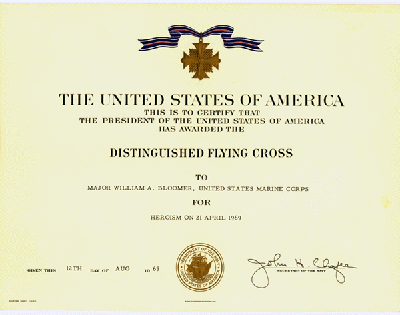 "For heroism and extraordinary achievement in aerial flight while serving as a Pilot with Marine Composite Reconnaissance Squadron One, Marine Aircraft Group Eleven, First Marine Aircraft Wing in connection with combat operations against the enemy in the Republic of Vietnam. On 21 April 1969, Major Bloomer launched as Aircraft Commander of an EA-6 Intruder assigned the mission of providing electronic countermeasures support for a United States Navy reconnaissance overflight of a heavily defended section of Vietnam. Arriving over the designated area, he established a flight pattern which would afford the reconnaissance aircraft the most protection, even though this pattern brought his Intruder well within the enemy's antiaircraft missile and artillery envelope. Completely disregarding his own safety, and concerned only with the success of this vital mission, he skillfully maintained an optimum protection flight path for a forty-minute period, thereby enabling his electronic countermeasures operator to effectively jam the hostile target acquisition radar and the reconnaissance flight to complete its mission...."